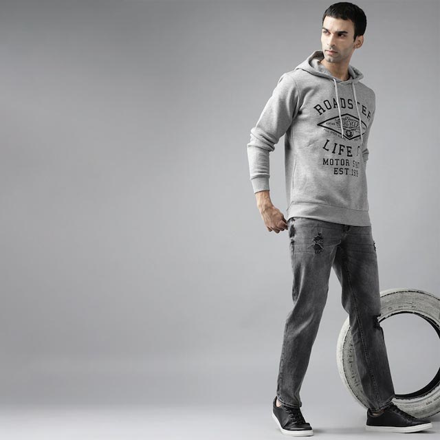 Grey melange brand logo print sweatshirt has a hood, 2 insert pockets, long sleeves, ribbed hem