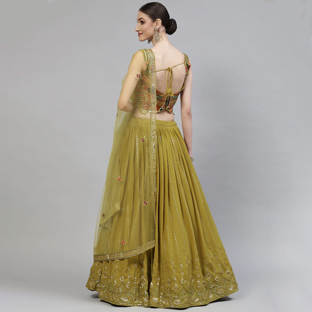 Mustard green embroidered lehenga choli with dupatta, sequin detail