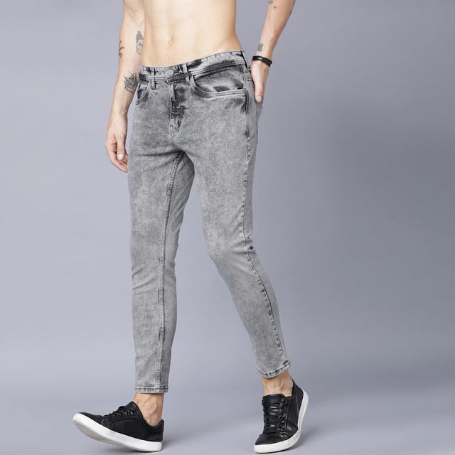 Grey medium wash jeans, clean look, heavy fade, has a button and zip closure, and waistband with belt loops