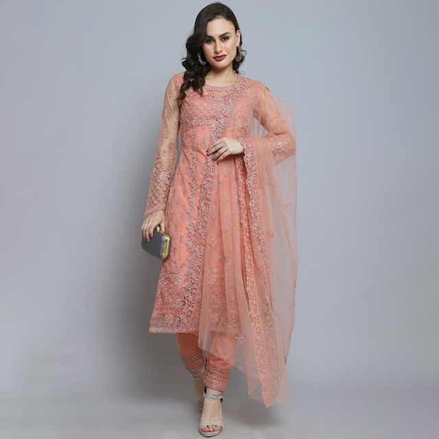 Peach-coloured and gold-toned embroidered unstitched dress material