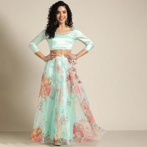 Blue & Green Embroidered Semi-Stitched Lehenga Choli