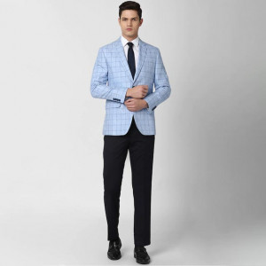 Men Blue Checked Linen Slim-Fit Blazers